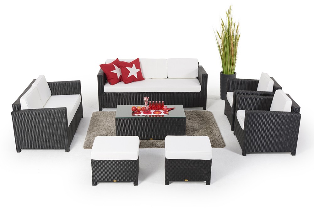 Artikelnummer 8155 Rahmen Aluminium Mehrfach verstrebt & sehr stabil Pulverbeschichtet & rostfrei Material Gartenmöbel Von Hand geflochtene, hochwertige Kunstfaser (Rattan) Farbe Möbel Schwarz Polsterfarbe Beige Material Sitzkissen und Bezüge Wasserabweisend, abnehm- & waschbar Extra bequeme 10 cm dicke Sitzpolster Baumwolle / Polyester Stückzahl 7 Lieferzeit 7 - 10 Arbeitstage