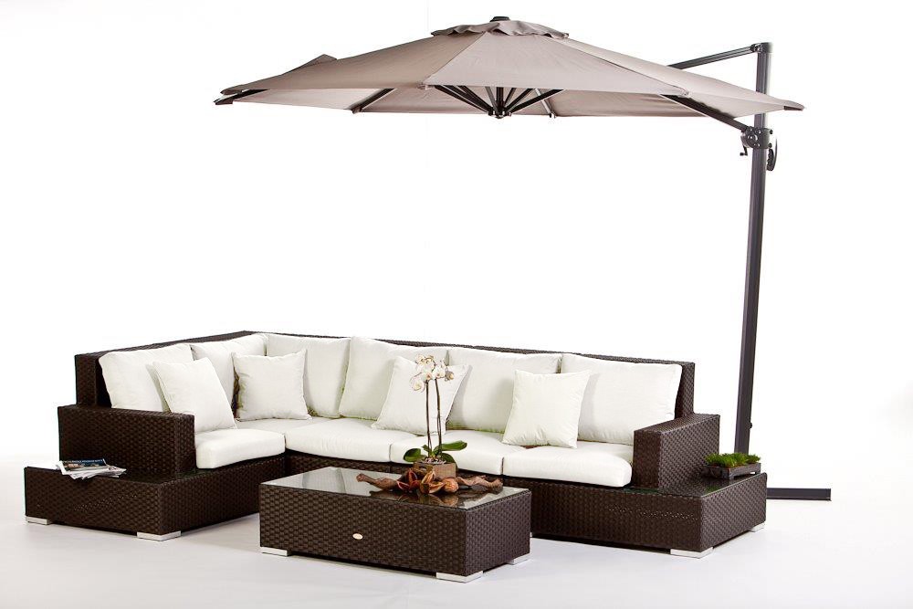 Die moderne Rattan Lounge aus braunem Rattangeflecht ist das ideale Loungemöbel. Die stylische Rattan Ecklounge mit den seitlichen Tischverlängerungen ist perfekt für entspannte Tage. Die Rückenlehne mit sandbrauner Polsterung ist höher als bei anderen Lounges, so dass man sich besonders bequem zurücklehnen und die Seele baumeln lassen kann. Das Gestell besteht aus Aluminium und bleibt auf Dauer rostfrei. Grundpolsterung: sandbraun. Dazu schenken wir Ihnen 3 Zierkissen im Wert von CHF 87.-.