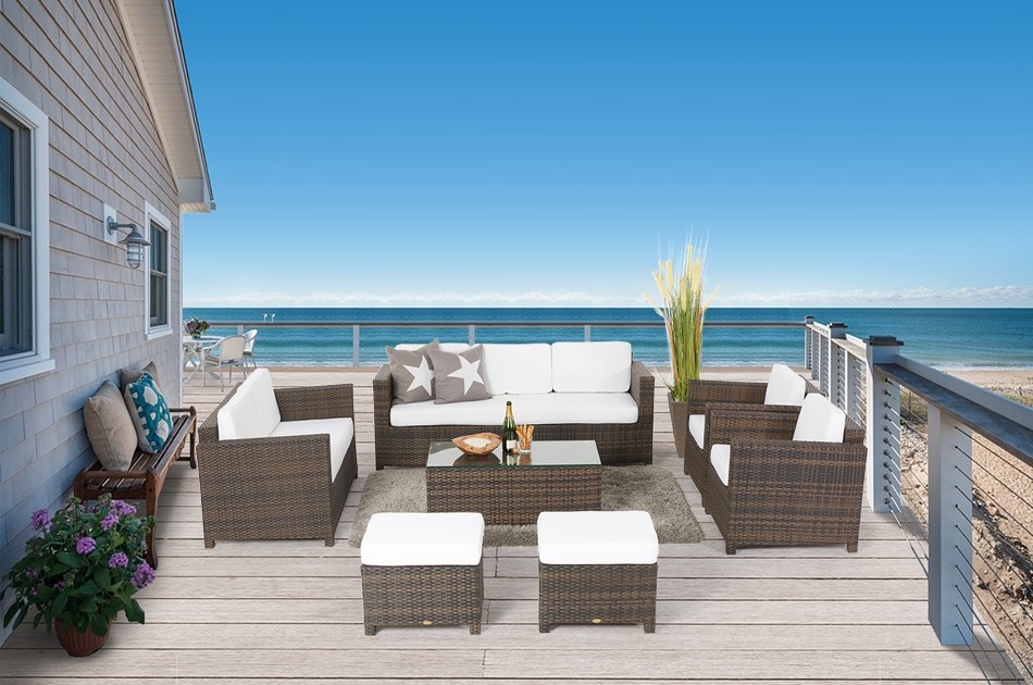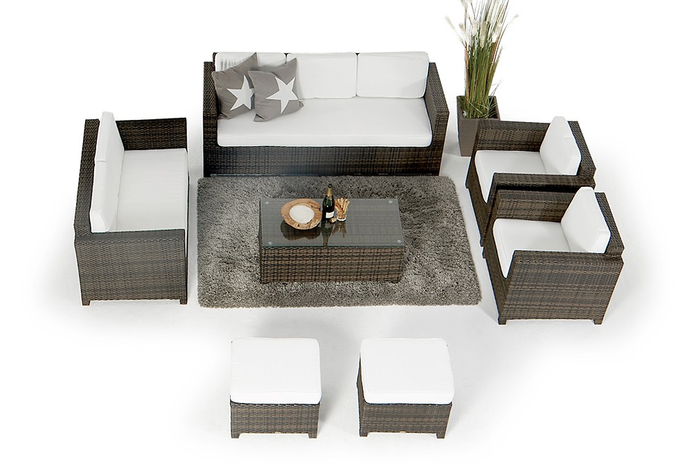 Artikelnummer 8153 Rahmen Aluminium Mehrfach verstrebt & sehr stabil Pulverbeschichtet & rostfrei Material Gartenmöbel Von Hand geflochtene, hochwertige Kunstfaser (Rattan) Farbe Möbel Braun Polsterfarbe Beige Material Sitzkissen und Bezüge Wasserabweisend, abnehm- & waschbar Extra bequeme 10 cm dicke Sitzpolster Baumwolle / Polyester Stückzahl 7 Lieferzeit 7 - 10 Arbeitstage